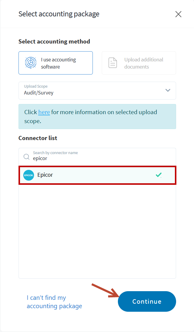 When the correct Accounting Package is selected click Continue.