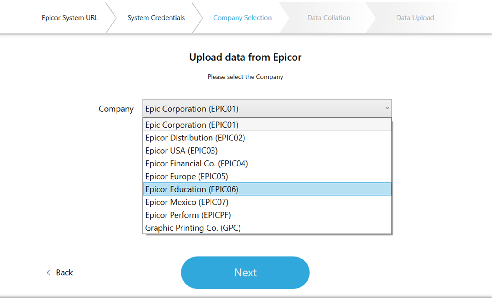 Select the appropriate Version of Epicor where your company data is stored and then click Next.
