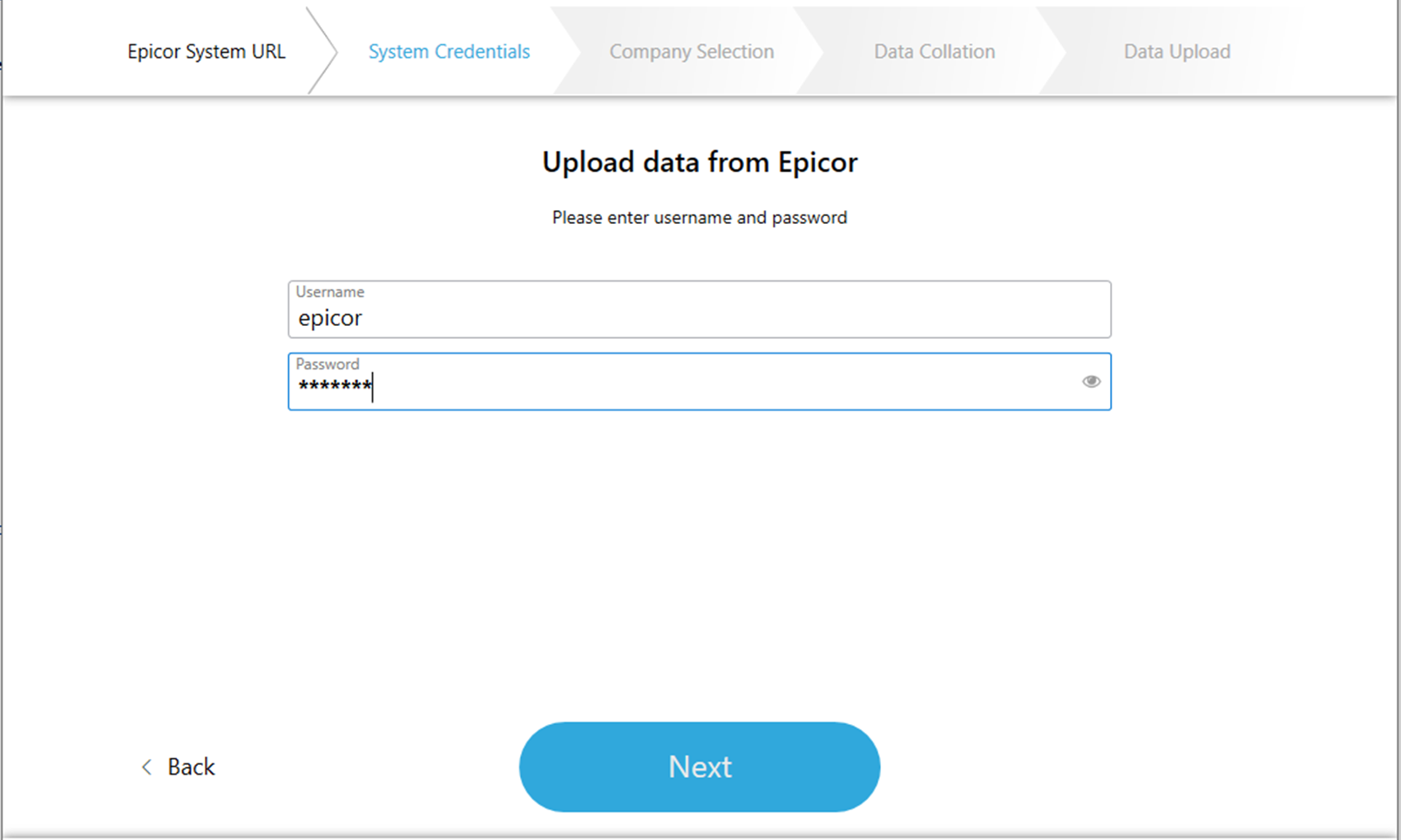 Enter the correct Username and Password for the company you have selected then click Next.